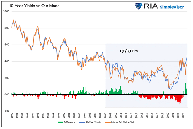 El siguiente gráfico utiliza un gráfico lineal para comparar nuestro modelo de regresión (línea de puntos anterior) con los rendimientos reales. Como muestra, se siguen mutuamente con precisión. Sin embargo, las barras diferenciales verde y roja muestran que los rendimientos de los bonos pueden desviarse del cálculo del valor razonable del modelo. Como destacamos, el aumento de la diferencia, o ruido, ha crecido desde 2008. Es probable que se deba a las actividades de compra de bonos de la Reserva Federal.