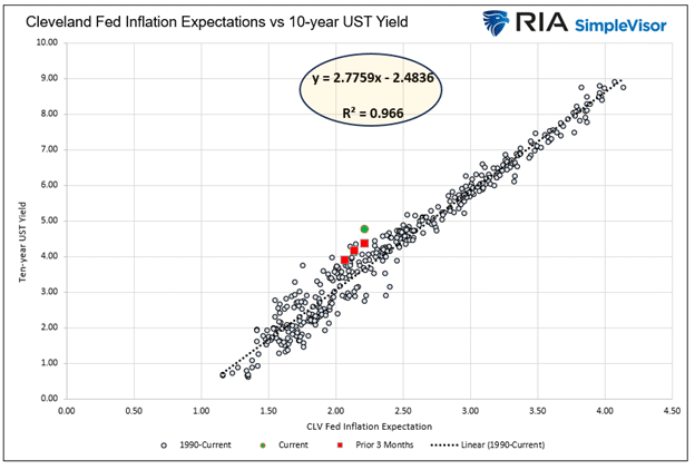El gráfico de dispersión mensual que aparece a continuación muestra que desde 1990, el rendimiento de los bonos a diez años y el índice de expectativas de inflación de la Fed de Cleveland, que también es a diez años, tienen un coeficiente de determinación o R cuadrado de 0,966. Sencillamente, el 97% del rendimiento de los bonos del Tesoro puede explicarse por el índice. Como se puede ver, el rendimiento actual (verde) se sitúa aproximadamente un 1% por encima de la línea de tendencia. Ergo, el rendimiento actual de los bonos está aproximadamente un 1% por encima del valor razonable.