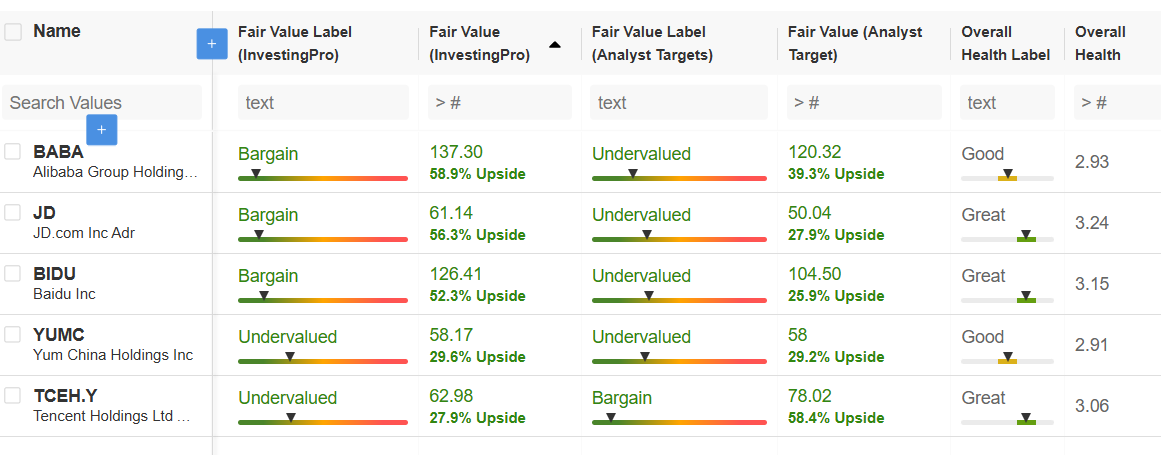 Chacune des 5 actions étudiées affiche un solide potentiel haussier, selon les analystes et selon la Juste Valeur InvestingPro. La Juste Valeur attribue notamment un potentiel haussier de plus de 50% à Alibaba, JD.com et Baidu. De plus, les scores de santé de toutes les entreprises de cette liste sont également très solides.